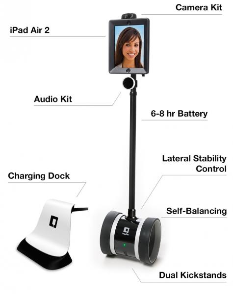 Double 2 Telepräsenzroboter (Fernsteuerbares fahrendes Videokonferenzsystem) inkl. Weitwinkelobejktiv, Audioerweiterung, Ladestation, IPAD Air 2 16 GB Wifi, Avatar-Roboter zur Steuerung aus der Ferne über WLAN/Internet. Gyroskop gestützte Antriebseinheit für Vorwärtsfahrt, lenken und drehen. Die Höhe ist per Knopfdruck bis ca. 150 cm verstellbar. Ansteuerung von überall über Android, PC oder Apple Endgeräte mit Kamera.